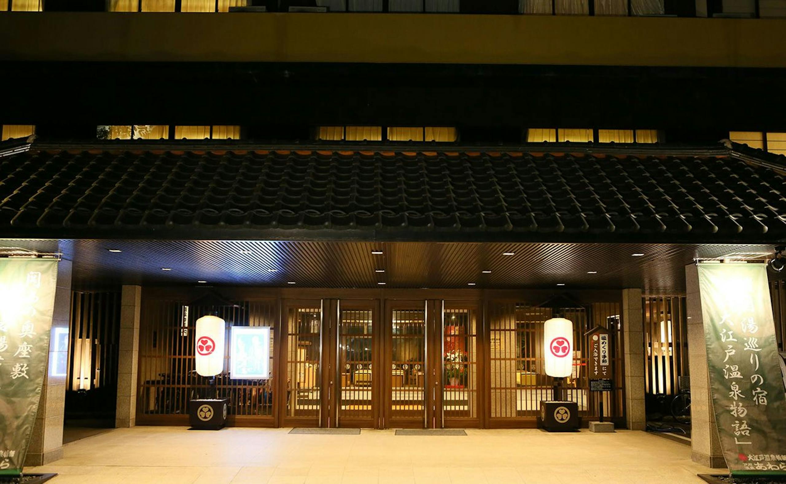大江戸温泉物語 あわらはJR芦原温泉駅から送迎バスで約15分、その温泉街の北部に位置する宿です。夕食バイキングは目の前で切り分けるローストビーフや揚げたての天ぷら、福井名物のソースかつ丼、おろしそば、カットケーキ、そして季節の創作メニューなどがビュッフェテーブルにならびます。