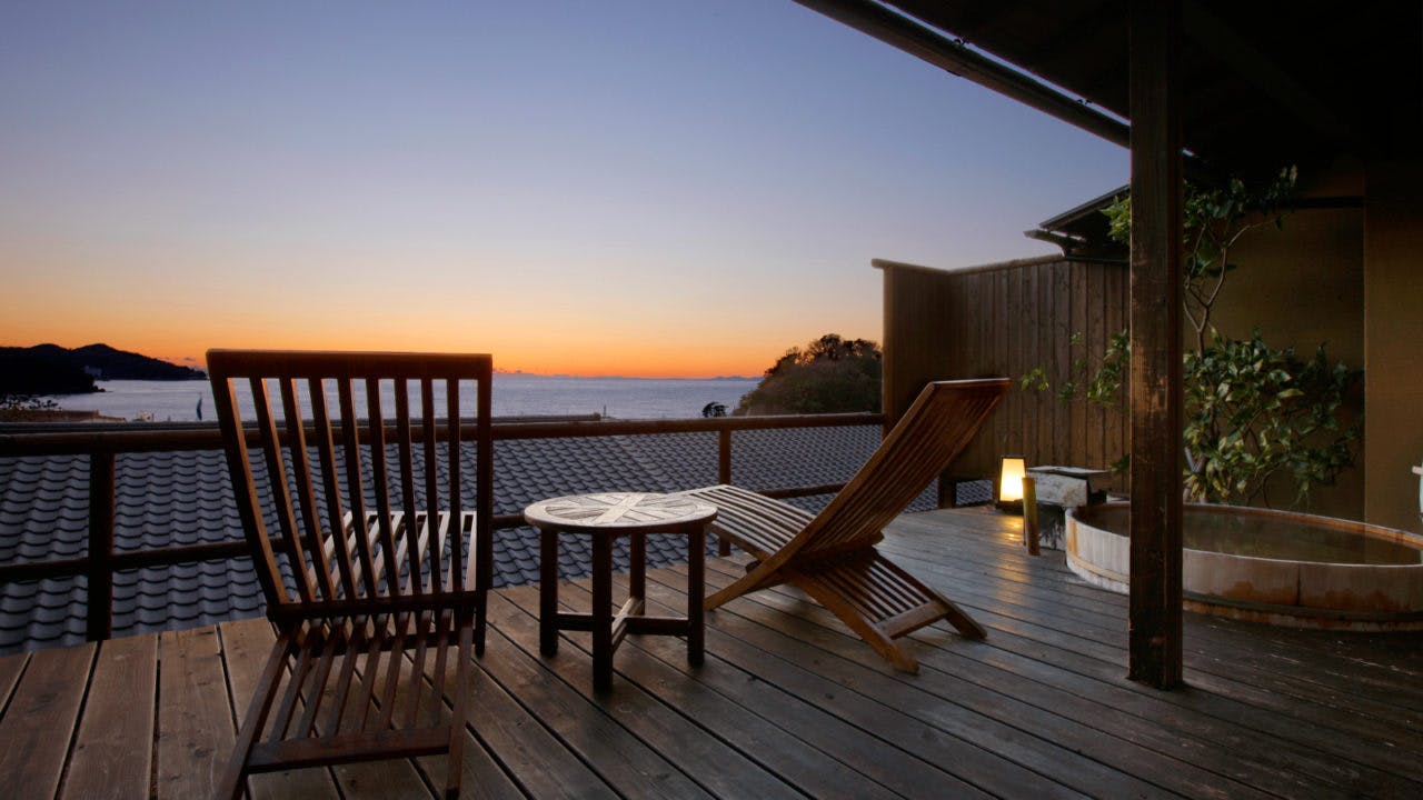 また源泉かけ流しの客室露天風呂で湯浴みすることもでき、天気の良い日にはテラスから綺麗な夕陽を眺められます。食事は季節の伊豆の食材などによる懐石料理を、個室の食事処にて提供されます。